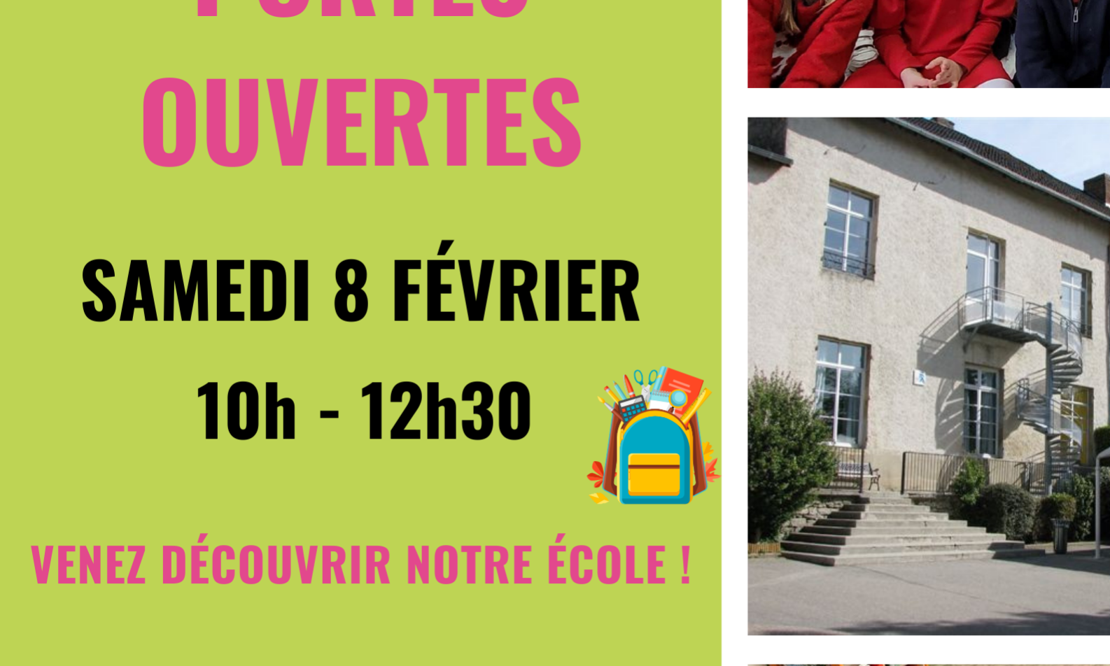 L’école du Château vous ouvre ses portes le samedi 8 février. Ce sera l’occasion de visiter l’établissement, échanger avec l’équipe pédagogique, découvrir nos projets… Nous vous attendons nombreux!